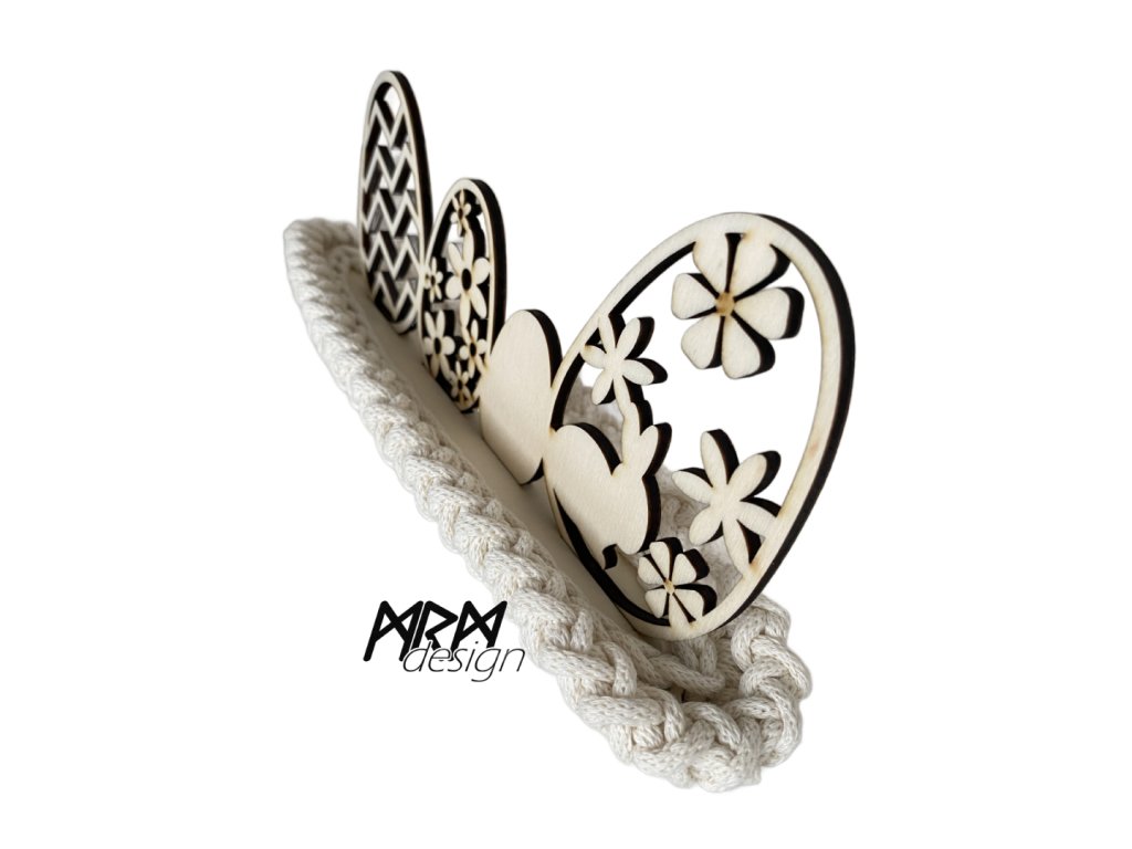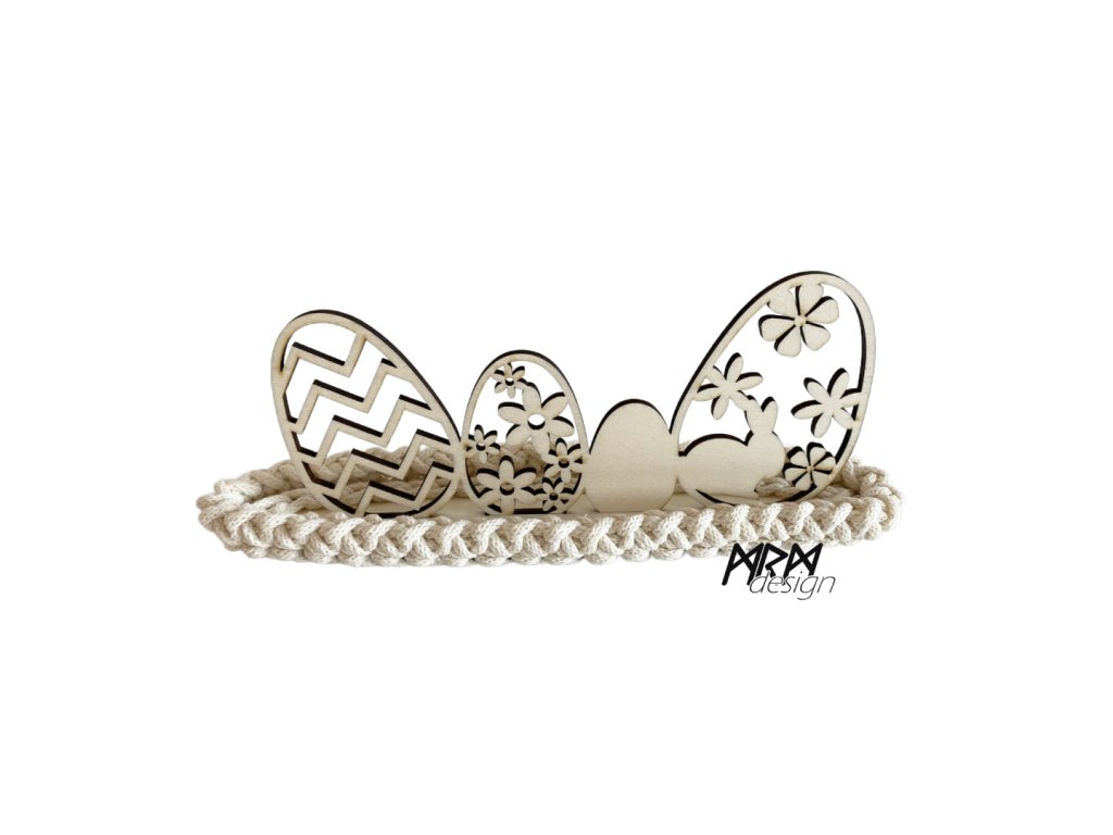 Dekorační vyřezávaná velikonoční vajíčka ve stojánku, který je obháčkovaný vysoce kvalitní pletenou bavlněnou šňůrou, vyrobenou ze 100% recyklované bavlny, certifikováno OEKO-TEX STANDARD 100, KL I.